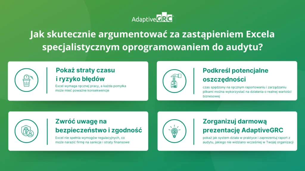 Przekonanie zarządu do zmiany narzędzia nie zawsze jest łatwe, ale argumenty oparte na realnych korzyściach, oszczędnościach i bezpieczeństwie mogą przechylić szalę decyzji. Excel nie jest już najlepszym rozwiązaniem dla nowoczesnego audytu – czas na system, który odpowiada na realne potrzeby organizacji.